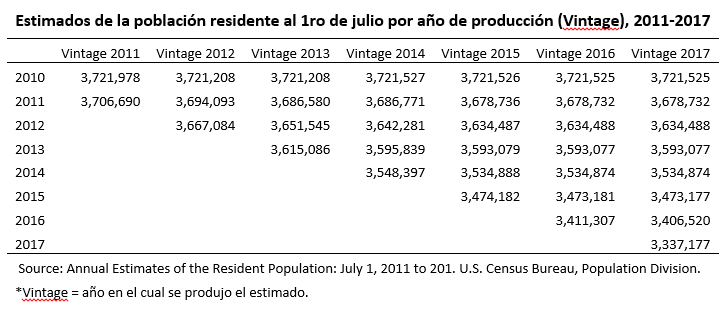 Luego de la realización de un Censo decenal, como el Censo 2010, el U.S. Census Bureau prepara los estimados anuales poblacionales antes del próximo Censo. Estos estimados se preparan mediante análisis de los datos de nacimientos, muertes y migración. Como resultado, con cada publicación nueva de los estimados, se realizan ajustes a los años previamente estimados. Por ejemplo, con la publicación de los estimados de 2017 anunciados en este comunicado, se revisaron los estimados ya publicados para el 2011, 2012, 2013, 2014, 2015 y 2016. Se distingue cada publicación según el año en el que se producen y son nombrados como Vintage.