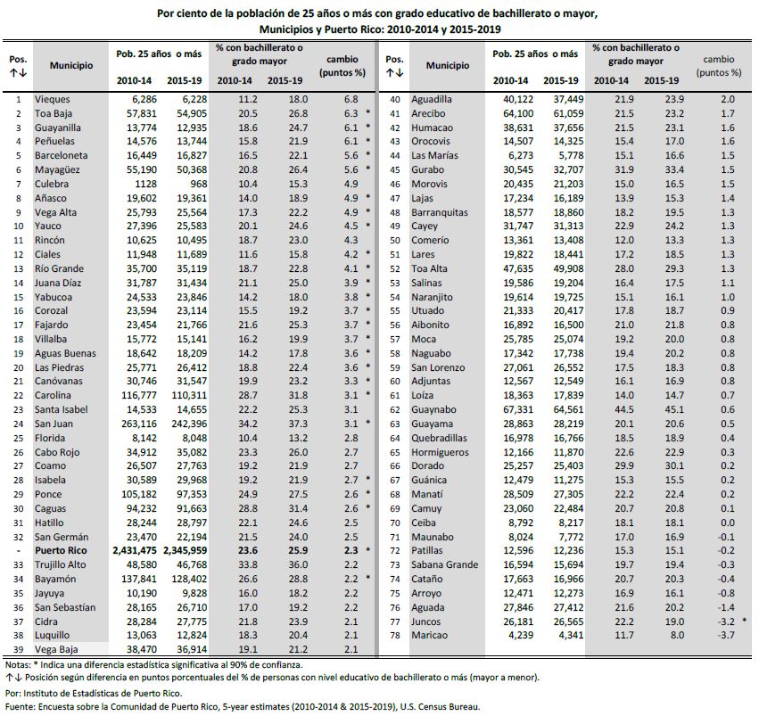 - En la población de 25 años o más de Puerto Rico, el por ciento de personas con grado educativo de bachillerato o mayor aumentó de 23.6% a 25.9%, siendo esta diferencia estadísticamente significativa.