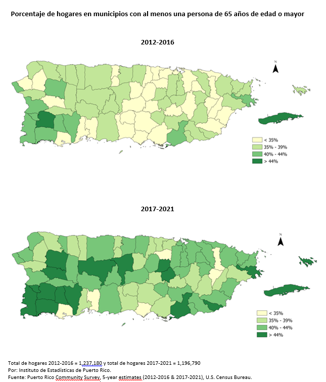 - Among the total number of households in Puerto Rico, the percentage of households with one or more people aged 65 years or older increased from 35.1% to 40.6%, this change being statistically significant.