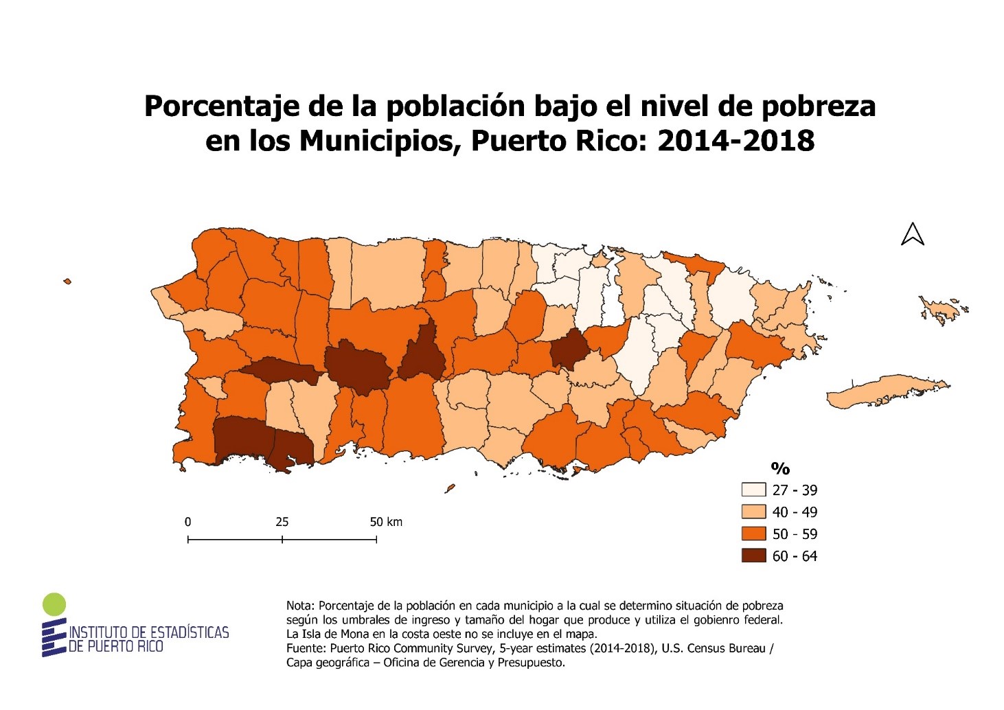 San Juan, PR, November 17, 2020 — The percentage of people living in poverty shows that six municipalities have between 60% and 64% of their population with this characteristic. The geographical distribution shows that they are located in the center and southwest of Puerto Rico, these being Maricao, Guánica, Adjuntas, Lajas, Jayuya and Comerío. La Selected Indicator Map Series includes the information collected during the period 2014-2018 through the Community Survey carried out by U.S. Census Bureau. This series includes ten indicators on demographic, social and economic topics at the level of municipalities and neighborhoods in Puerto Rico.